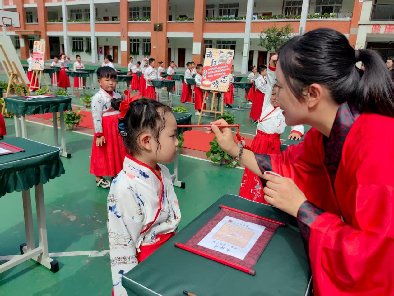 典礼依次进行了“正衣冠”“孝亲敬师”“朱砂启智”“击鼓鸣志”“启蒙描红”及“集体吟诵”六大传统环节。在“正衣冠”环节,学生们自正衣冠、师正衣冠,展现出良好的精神风貌;“孝亲敬师”礼中,学生分别向至圣先师孔子、启蒙教师和父母行鞠躬礼,传承中华民族尊师孝亲的传统美德。