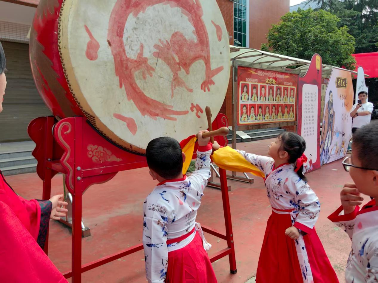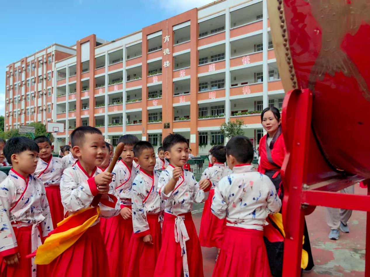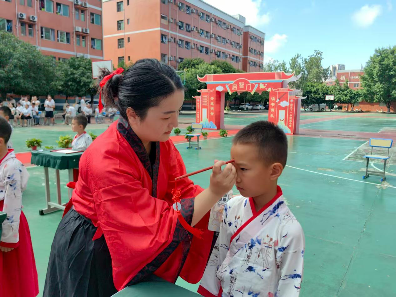 “朱砂启智”环节将仪式推向高潮。老师们用朱砂笔在学童额前轻点红痣,寓意开启智慧、心明眼亮。随后进行的“击鼓鸣志”由学校德育部杨主任击鼓三通,学生跟随宣誓:“尊敬师长”“热爱学习”“为校争光”,铿锵鼓声与稚嫩誓言交融,彰显出新学子远大志向。